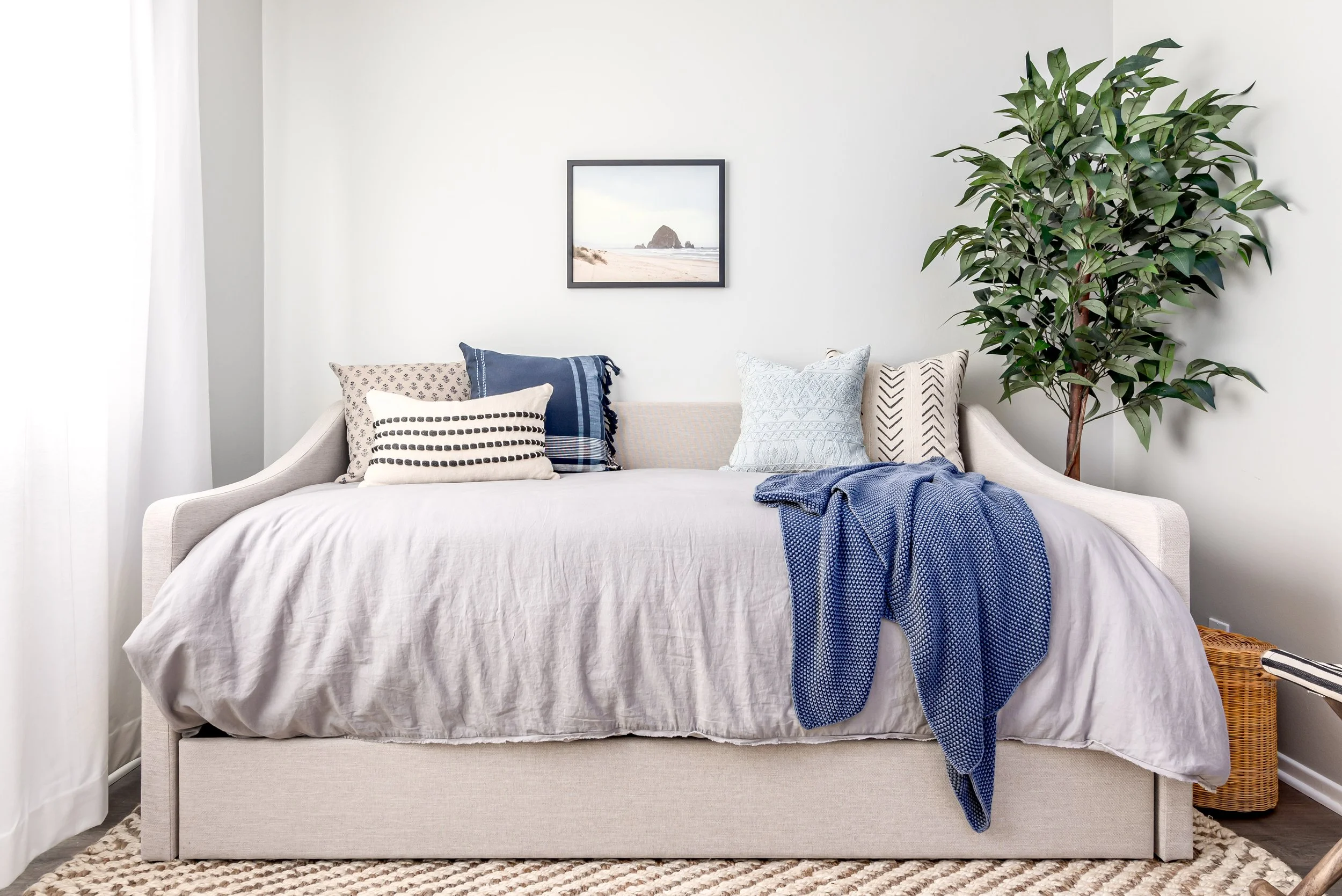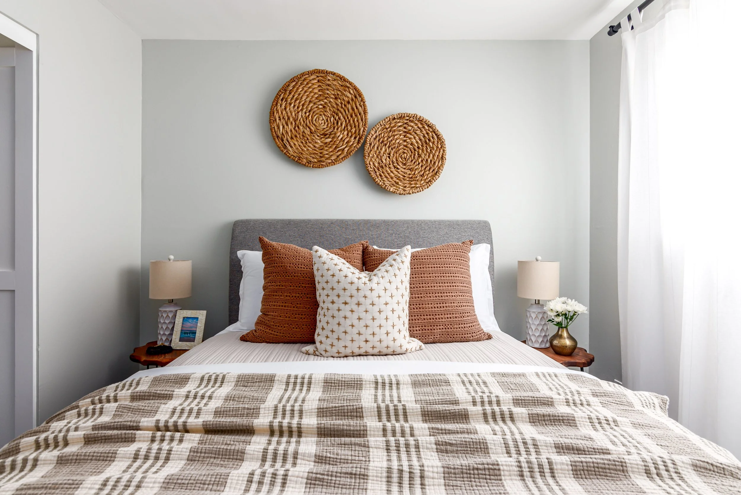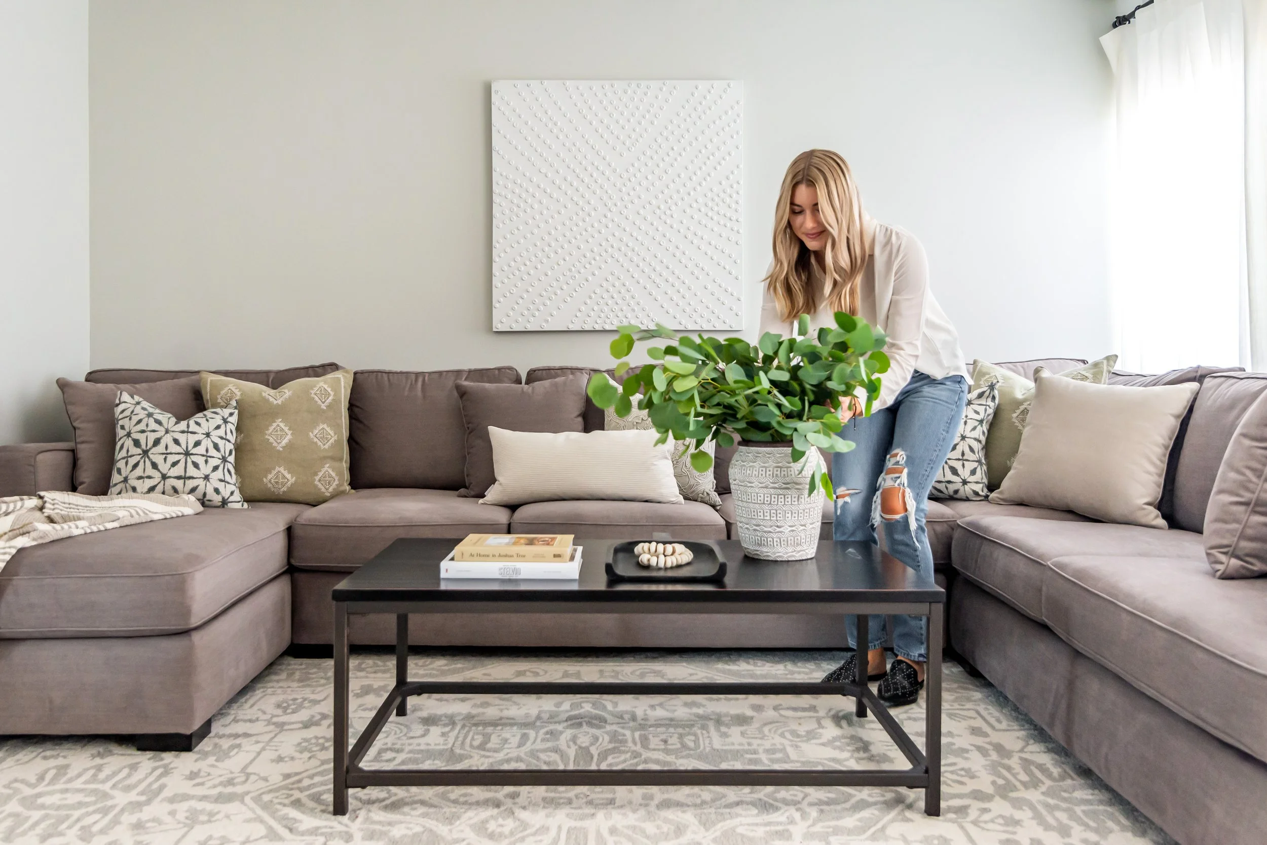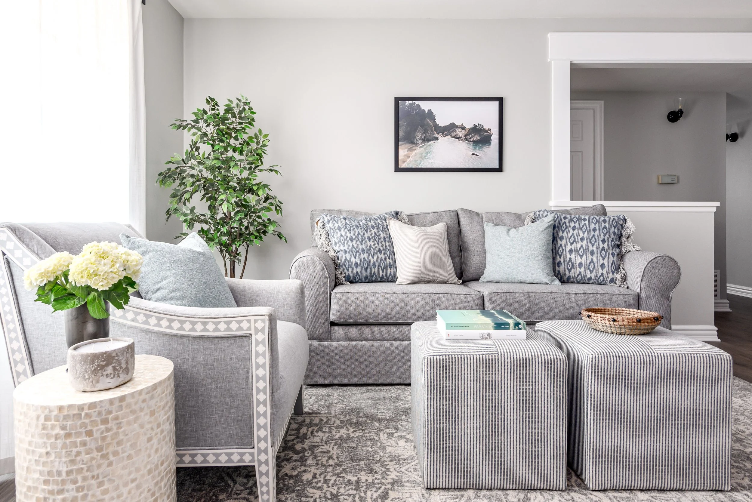 This project features a transitional style design with organic elements and muted pops of color. We took some of the clients pieces and incorporated fresh new furnishings, art, and accessories to really add charm to each space. The home is near a beach town and we brought some of those coastal touches in with the color palette, art, and lots of greenery and texture.