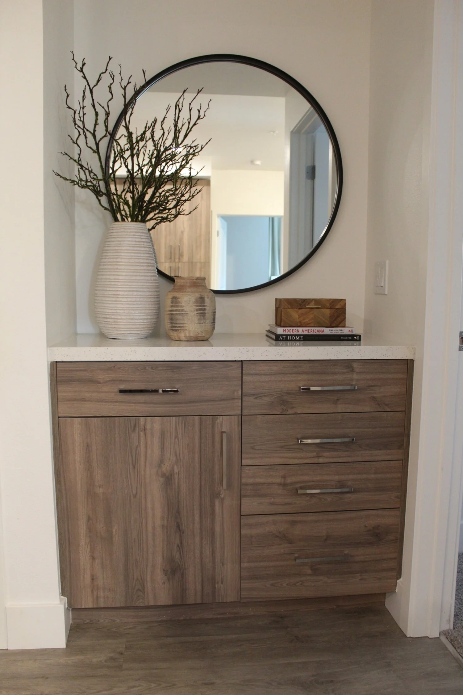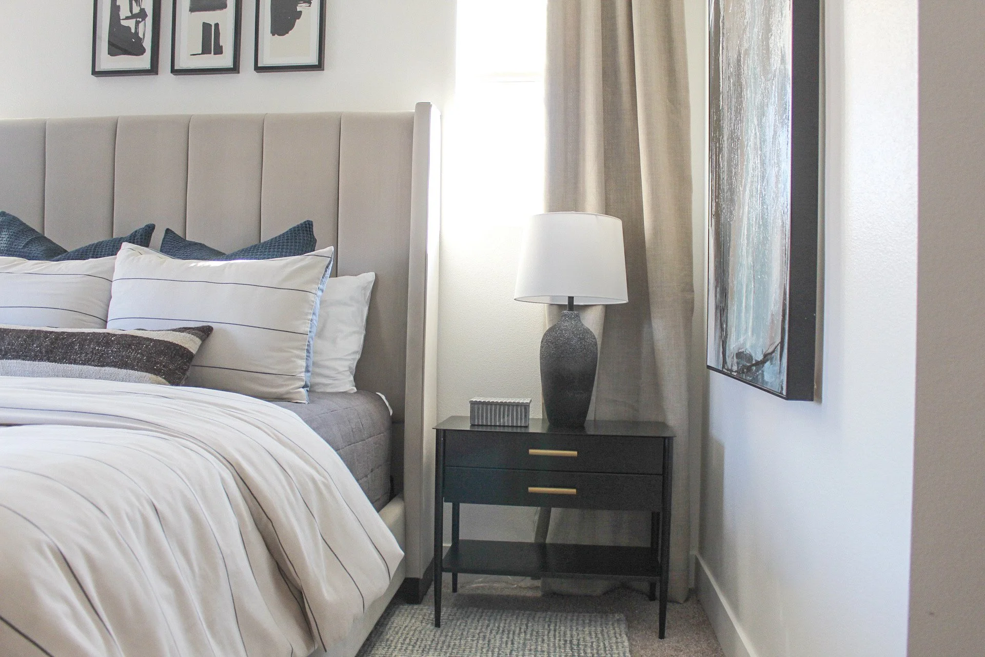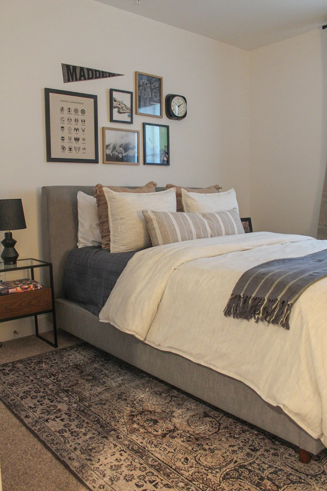 A sleek and modern design created for a father and son looking for a cool and masculine space. The neutral palette was layered with pops of blue, pattern, and texture. The teen bedroom captured all his favorite movies and characters while still maintaining a mature style he can grow into.